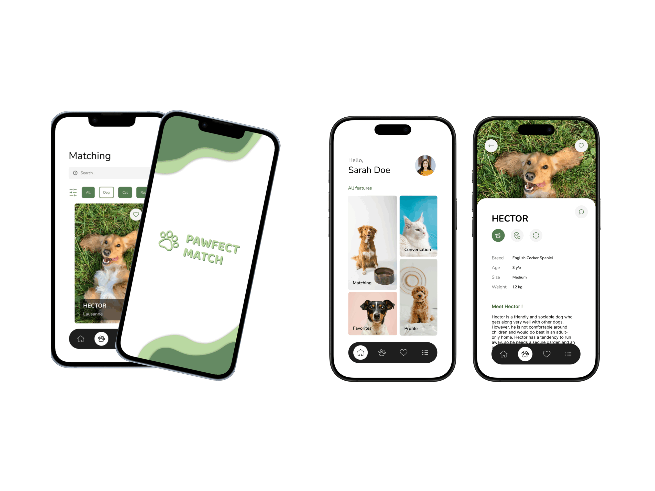 Dans le cadre du cours BaseUI de deuxième année de mon Bachelor, j’ai créé le prototype d’une application mobile sur Figma. Parmis les choix imposés, j’ai décidé d’imaginer Pawfect Match : un Tinder pour les animaux à adopter.